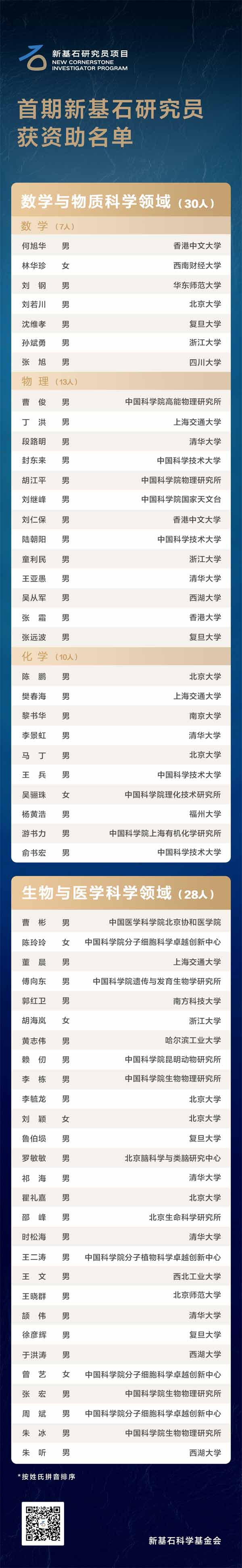 作为目前国内社会资金资助基础科研力度最大的公益项目之一,“新基石研究员项目”今日(1 月 13 日)揭晓首期获资助名单,来自数学与物质科学、生物与医学科学两大领域的 58 位杰出位科学家,成为首批新基石研究员。