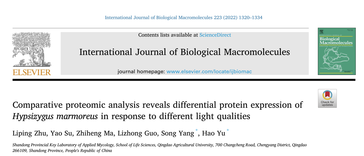 近期青岛农业大学食用菌精准育种实验室通过蛋白质组技术团队在国际上首次研究了光照对于白玉菇代谢的影响,结果发表在International Journal of Biological Macromolecules杂志上(图1)。