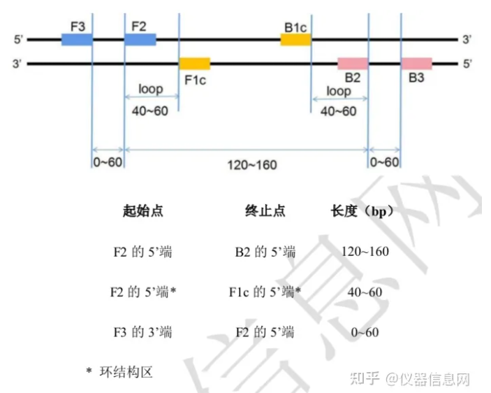 LAMP的特点是使用4或6种不同的引物,专门设计用于识别目标基因的6个不同区域,包括3'端的F3c、F2c和F1c区域和5'端的B1、B2和B3区域,如图1所示。引物设计包括: