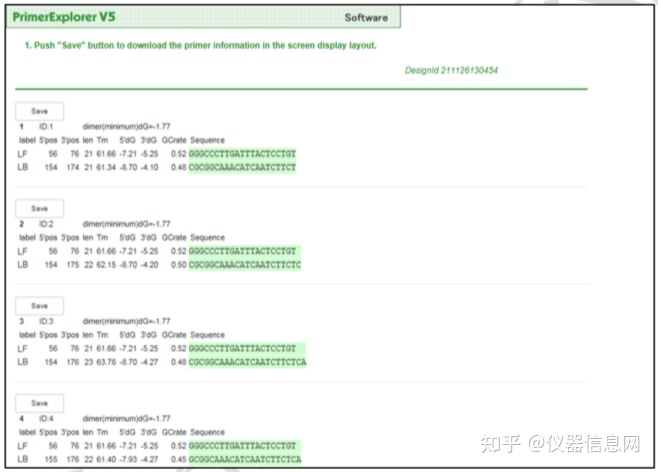 当靶序列载入系统后,PrimerExplorer 会自动判断 GC 含量,并将靶序列按照 AT 富含 序列(GC% < 45)、一般序列(45 <GC% < 60)和 GC 富含序(GC% > 60)三种类型分别 匹配不同的引物设计参数。系统可以对设计出的引物末端序列进行自动检查,去除存在互补 序列(如 CCCGGG、GAATTC)或者多个相同核苷酸序列(如 CCGGGG、AATTTT)的引 物对。同时还会检查引物与靶序列的互补性,如果引物末端与扩增区以外的靶序列也存在互 补,则可能产生非特异性扩增,这样的候选引物也需去除。所设计的引物关键信息如引物在 靶序列中所在位置、Tm 值等可以自动保存并下载到 Excel 文件中。