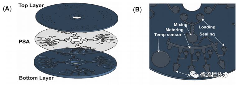 Abkar Ahmed Sayad 等开发出一种碟式离心型微流控装置。该装置分为三层,底部PMMA层,中间压敏胶(PSA)粘合层和底部PMMA层。微流控通道通过切刻机在底层制作出混合试剂、测量、 等温扩增和检测的微流控腔室。LAMP 实验的排气和装载孔、蜡、密封材料放在微流控 CD 顶层。该系统,对添加沙门氏菌的番茄进行检测,检出限为 5×10-3 ng/uL。整个过程,从样品制备到检测,可以70min内在微流控 CD 上全自动化完成。